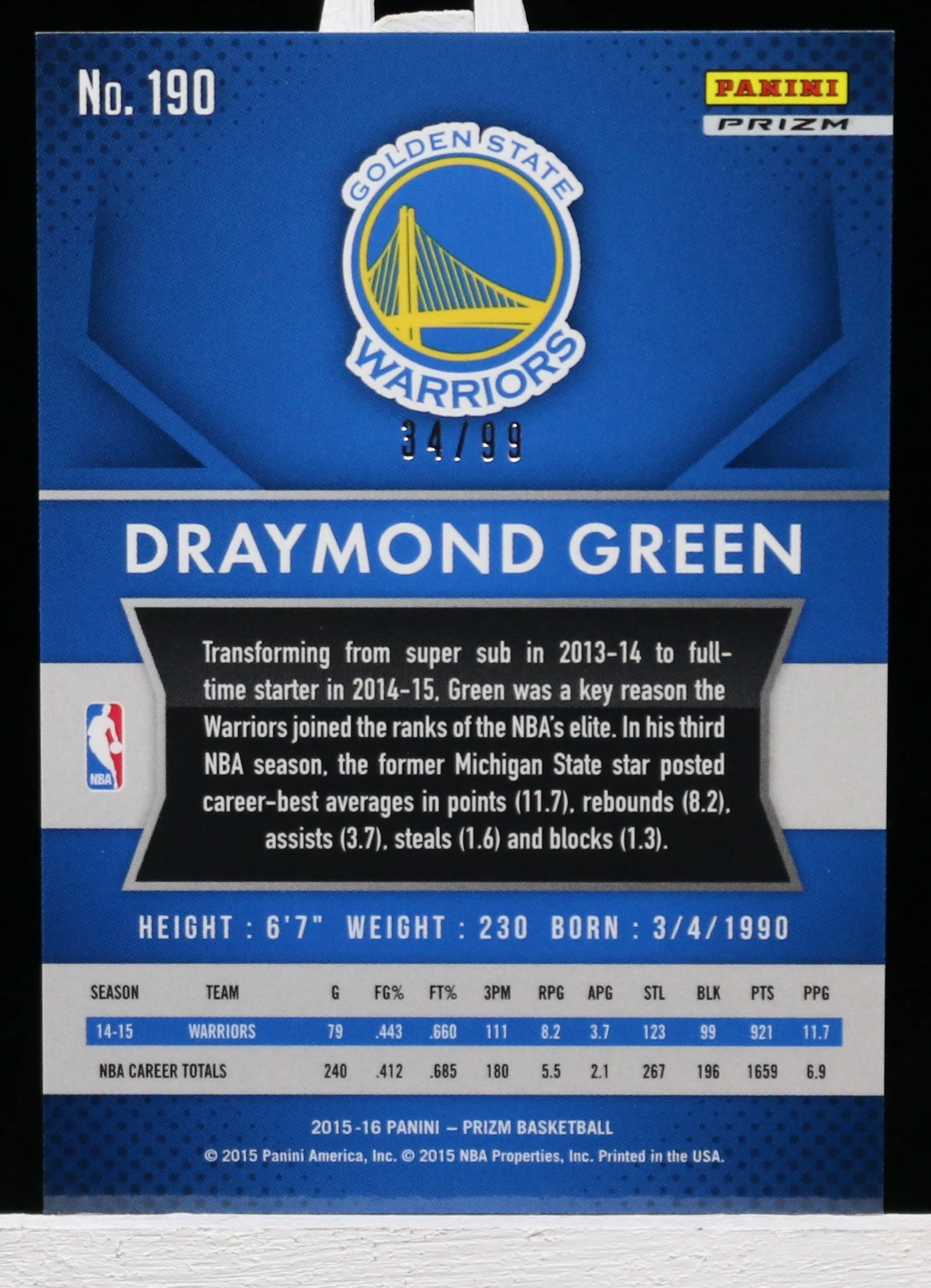 Card Shop › 2015-16 Panini Prizm Draymond Green #190 Image 1 of 2 Image 2 of 2 2015-16 Panini Prizm Draymond Green #190 $10.00 Purple Prizm #34/99This card ships sleeved within a standard top loader. Add To Cart Added! Purple Prizm #34/99This card ships sleeved within a standard top loader.